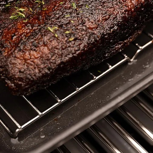 Wbudowany ruszt unosi potrawę nad dnem brytfanny, dzięki czemu tłuszcz i soki swobodnie spływają na dół. Mięso nie leży w płynie, co pozwala uzyskać lepszą teksturę i równomierne pieczenie.